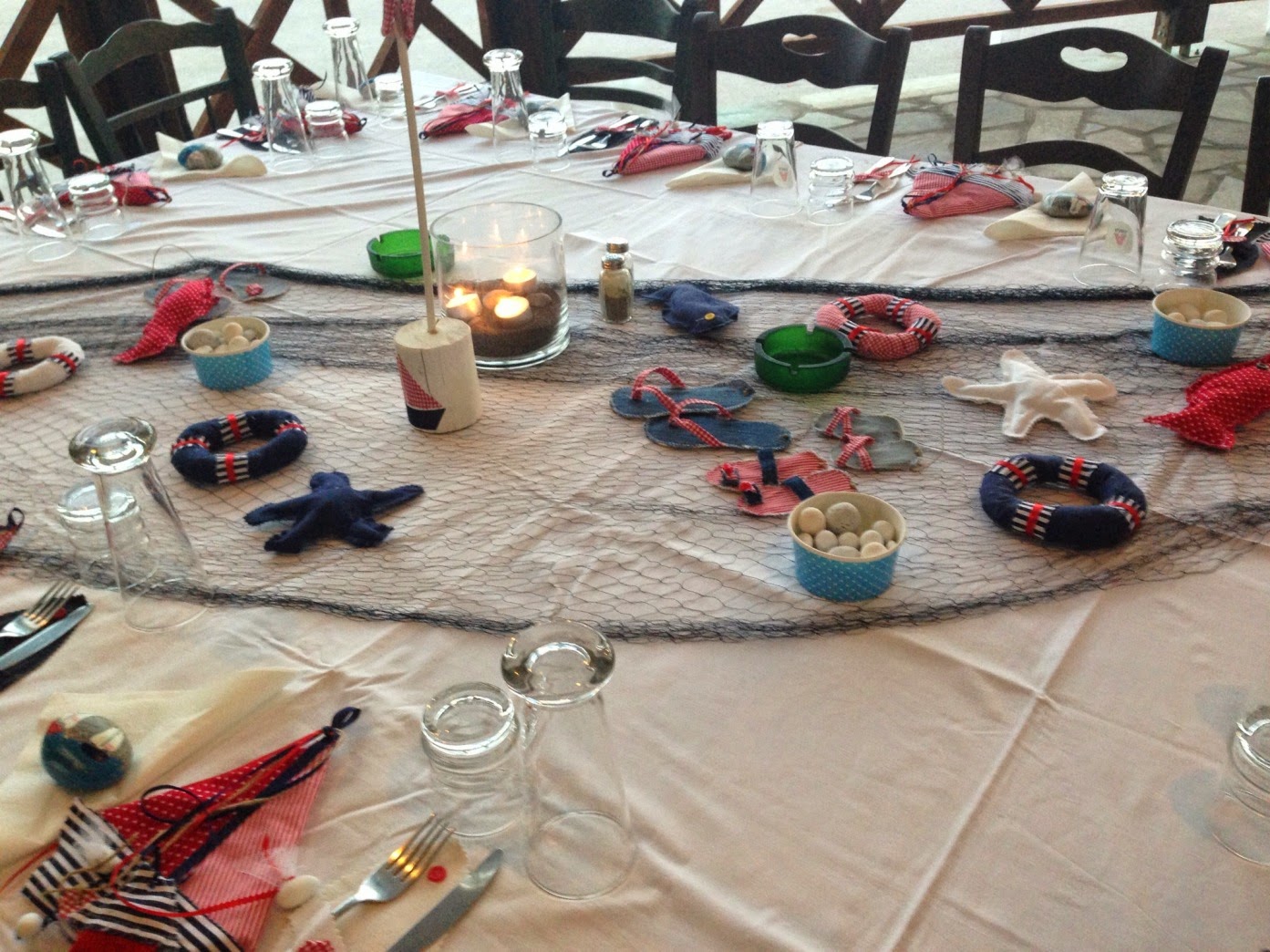Δεξιά και αριστερά από την μπομπονιέρα καραβάκι ζωγραφισμένες πετρούλες που μία - μία είχαν μαζευτεί από την παραλία έγραφαν το όνομά μου και την ημερομηνία της βάφτισής μου και στερέωναν την χαρτοπετσέτα ενώ τα μαχαιροπίρουνα ήταν τοποθετημένα σε θήκη - ψαράκι!