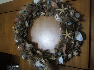Το τρίτο στεφάνι άκρως καλοκαιρινό με λινάτσα και όστρακα αλλά και πινελιές από γαλάζιο τριανταφυλλάκι σαν σταγόνες θάλασσας. Ψαράκια υφασμάτινα κι τυρκουάζ γυαλάκια ολοκληρώνουν το στεφάνι αυτό.
