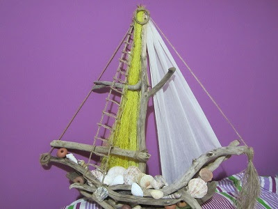 Πρώτο θέμα λοιπόν το αγαπημένο μου στοιχείο, τα θαλασσόξυλα! Ένα καράβι με ύψος 80 εκατοστά και άνοιγμα το 1 μέτρο! Τα πανιά του από λευκή γάζα και ένα κομμάτι δίχτυ, ένα δίχτυ χιλιοψαρεμένο που θα συνεχίσει να αρμενίζει τα πέλαγα ατενίζοντας την αιγαιοπελαγίτικη θάλασσα! Κουβαλάει φορτίο μεγάλο από όστρακα που η μυρωδιά τους σε καλεί για μια δροσερή  βουτιά